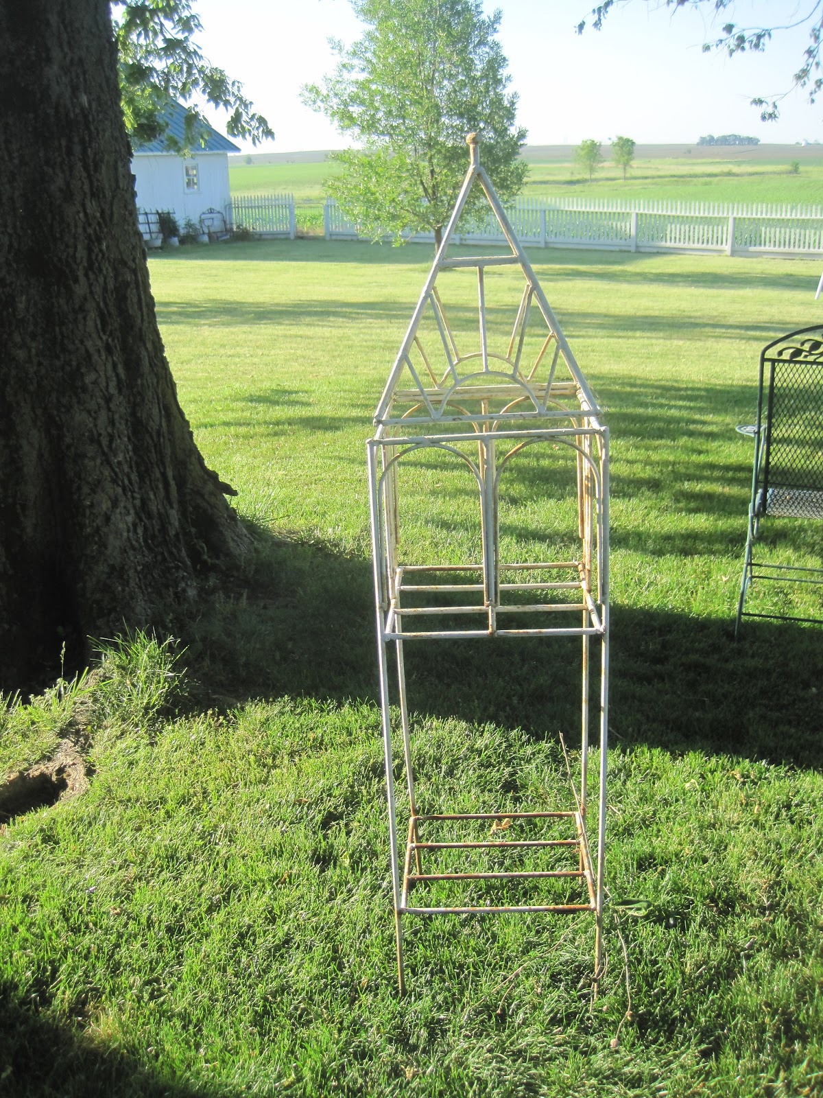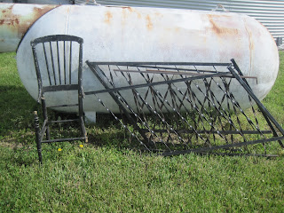 Old chair-great to hang on the wall with a quilt on it and curvy iron porch pieces-great for a garden!