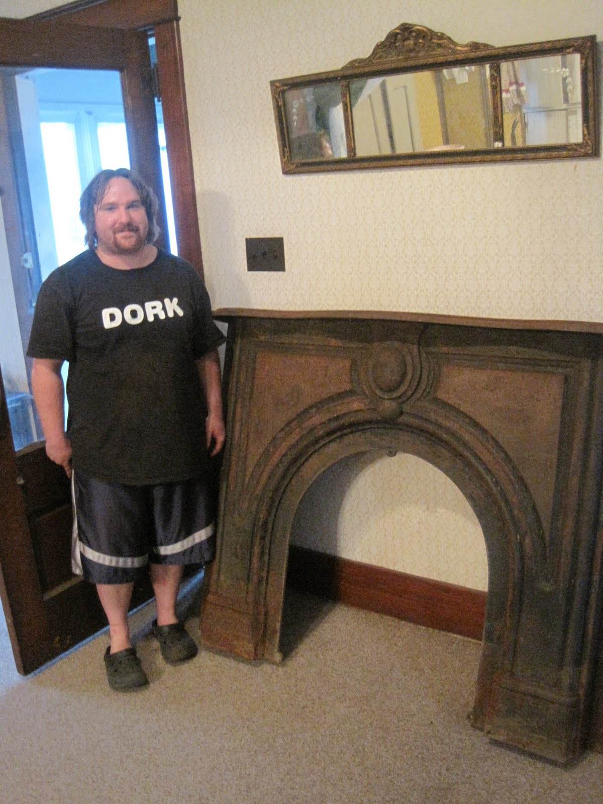 tonite because I really wanted this cast iron mantle to be in the meeting house where I am trying to make it look like a boarding house for the upcoming Trials and Tribulations event. The mantle was in the basement of the Rutherford house and I knew it was really heavy-what I didn't know was that our three men of the group weren't going to show up and it was nailed to the wall. So I called my BF